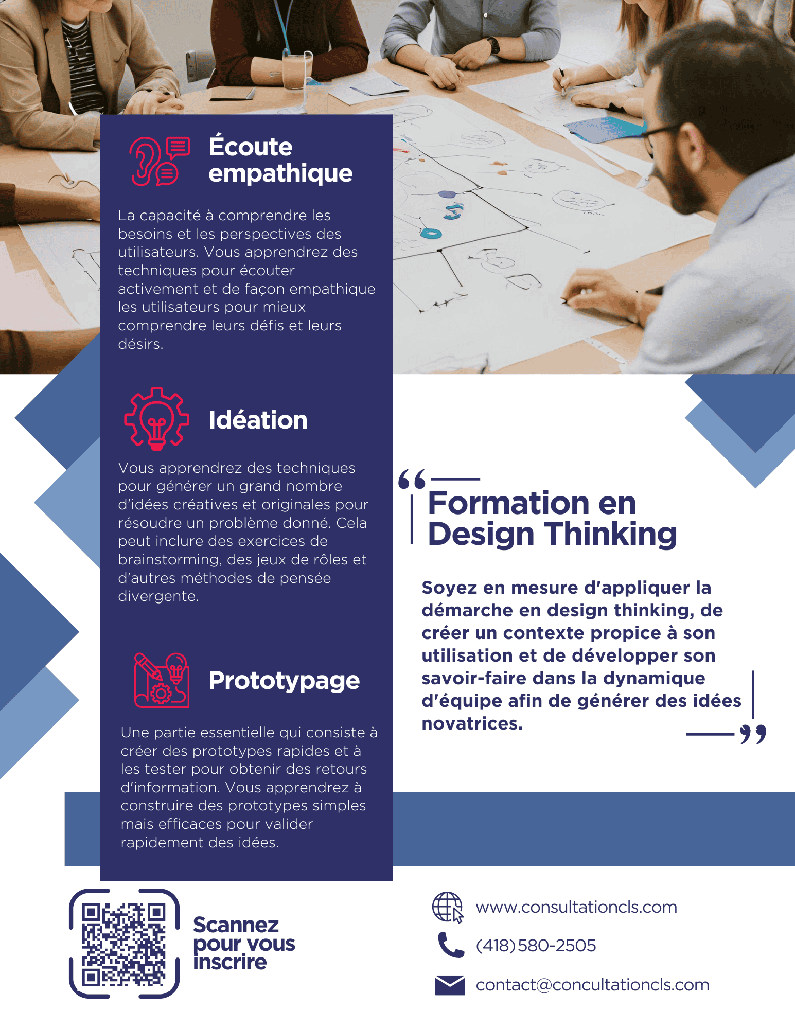 Objectif : Le participant sera en mesure d’appliquer la démarche en design thinking, de créer un contexte propice à son utilisation et de développer son savoir faire dans la dynamique d’équipe afin de générer des idées novatrices.
