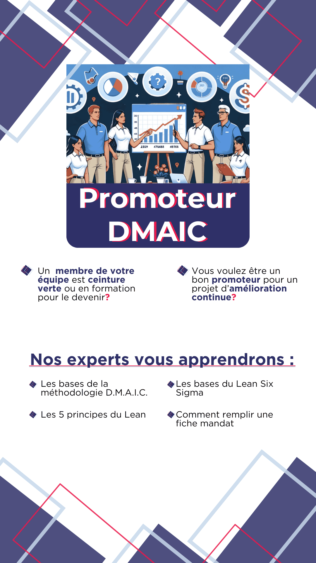 Objectif : Être en mesure d’être le promoteur d’un projet d’amélioration continue et de transformation Lean, d’aiguiller et diriger activement la ceinture verte chargée du projet.